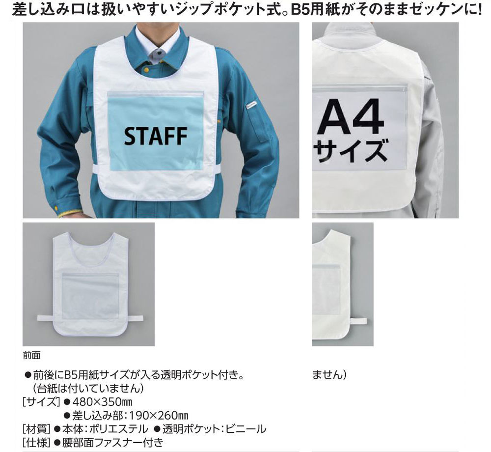 メーカー:日本緑十字社 サイズ 480×350mm 差し込み部:190×260mm 材質 本体:ポリエステル 透明ポケット:ビニール 仕様 腰部面ファスナー付き 前後にB5用紙サイズが入る透明ポケット付き(台紙は付いていません)