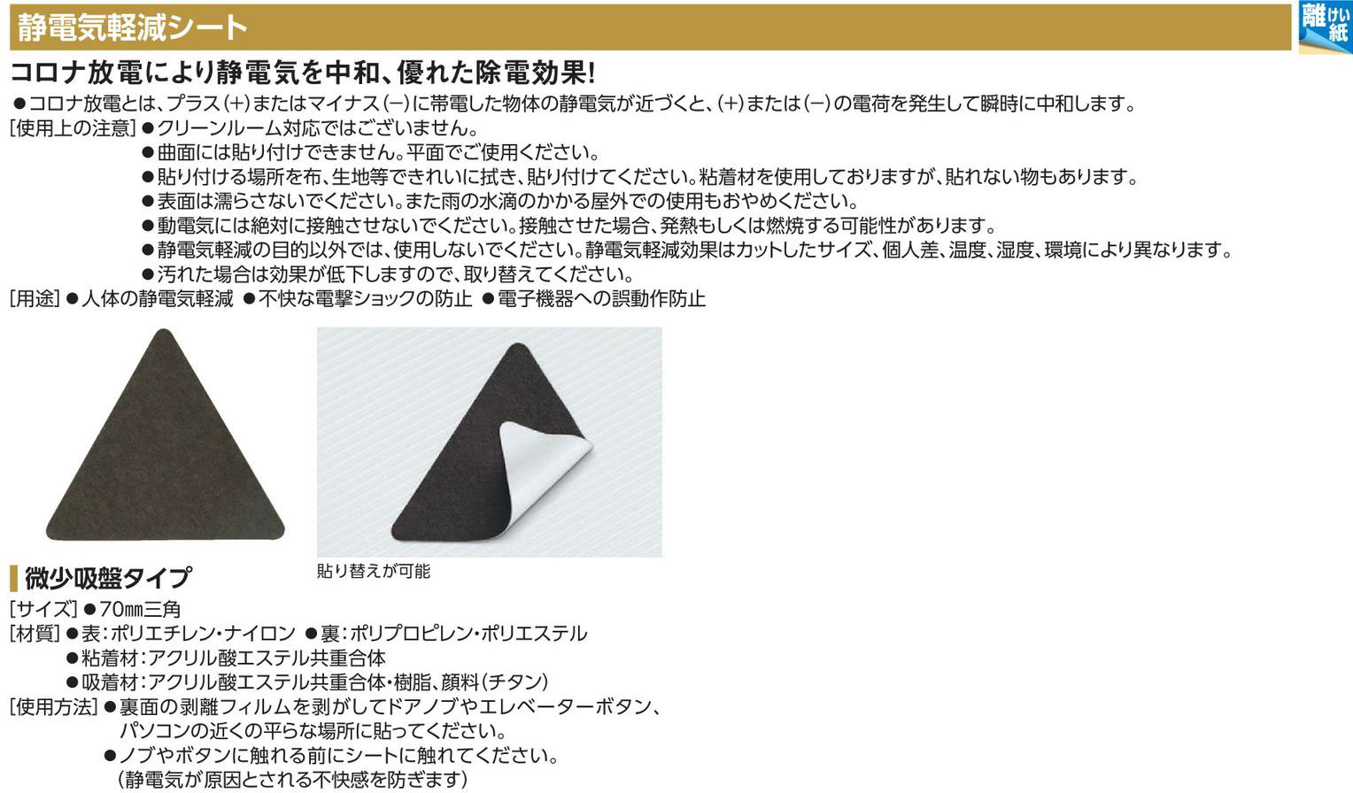 メーカー:日本緑十字社 サイズ 70mm三角 材質 表:ポリエチレン・ナイロン 裏:ポリプロピレン・ポリエステル 粘着剤:アクリル酸エステル共重合体 吸着剤:アクリル酸エステル共重合体・樹脂、顔料(チタン) 使用方法 裏面の剥離フィルムを剥がしてドアノブやエレベーターボタン、パソコンの近くの平らな場所に貼って下さい。 ノブやボタンに触れる前にシートに触れてください。(静電気が原因とされる不快感を防ぎます。) ※貼り替え可能タイプ ※100℃未満でご使用ください。