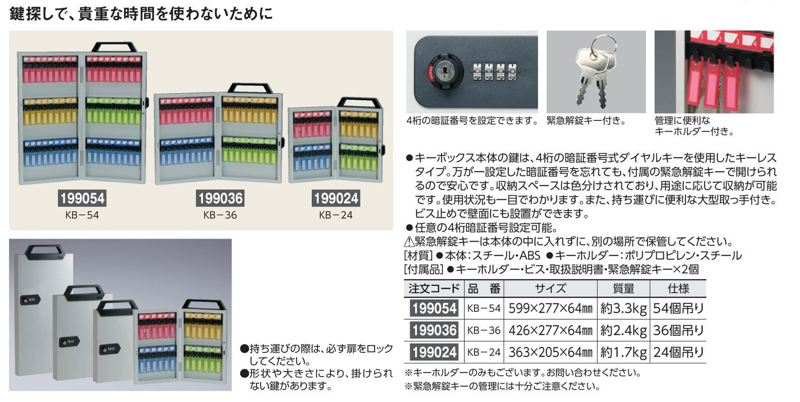メーカー:日本緑十字社 サイズ 426×277×64mm 質量 約2.4kg 仕様 36個吊り 材質 本体:スチール・ABS キーホルダー:ポリプロピレン・スチール 付属品 キーホルダー・ビス・取扱説明書・緊急解除キー×2個
