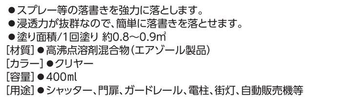 材質 高沸点溶剤混合物(エアゾール製品) カラー クリヤー 容量 400ml 用途 シャッター、門扉、ガードレール、電柱、街灯、自動販売機等