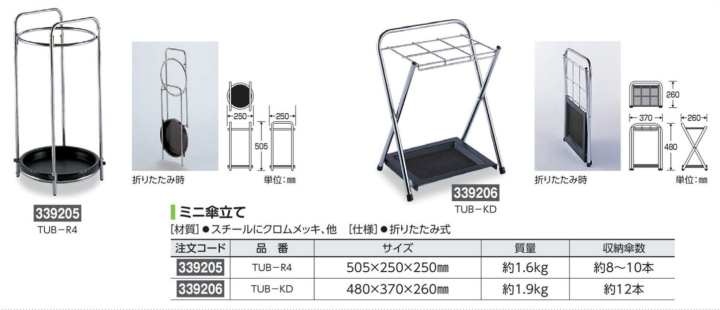 メーカー:日本緑十字社 サイズ 505×250×250mm 質量 約1.6kg 収納傘数 約8~10本 材質 スチールにクロムメッキ、他 仕様 折りたたみ式