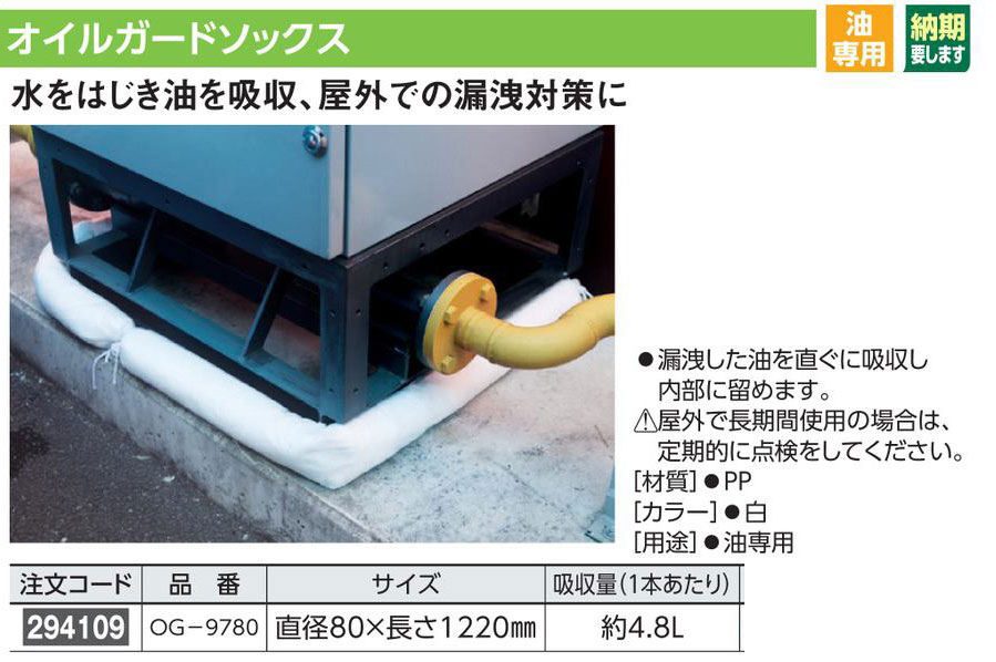 メーカー:日本緑十字社 サイズ 直径80×長さ1220mm 吸収量(1本あたり) 約4.8L 材質 PP カラー 白 用途 油専用 12本1組