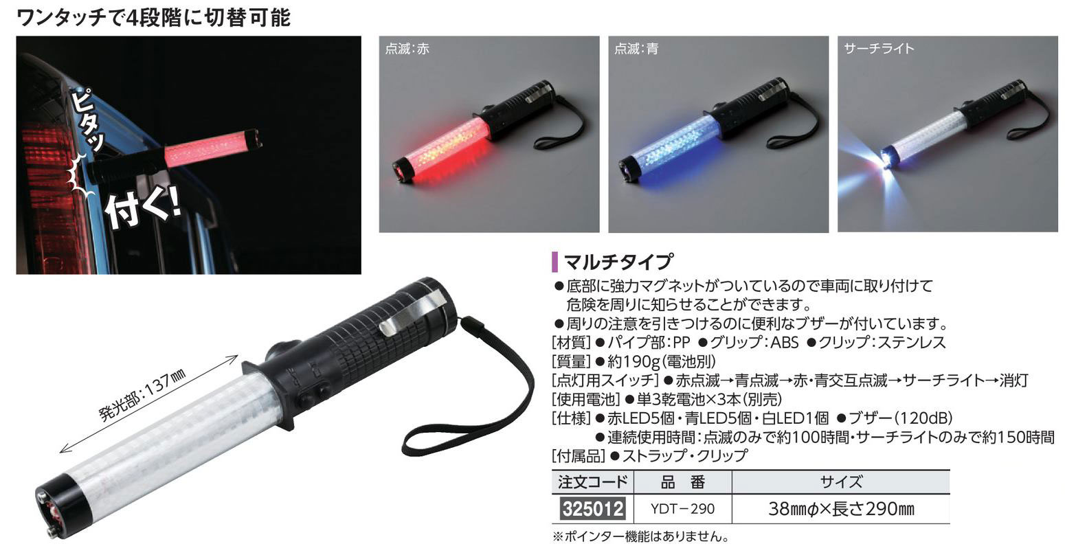 メーカー:日本緑十字社 サイズ 38mmΦ×長さ290mm 材質 パイプ部:PP グリップ部:ABS クリップ:ステンレス 質量 190g(電池別) 点灯用スイッチ 赤点滅→青点滅→赤・青交互点滅→サーチライト→消灯 使用電池 単3乾電池×3本(別売) 仕様 赤LED5個・青LED5個・白LED1個 ブザー(120dB) 連続使用時間:点滅のみで約100時間・サーチライトのみで約150時間 付属品 ストラップ・クリップ ※ポインター機能はありません。