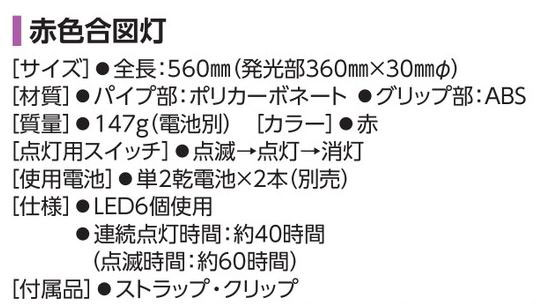 メーカー:日本緑十字社 サイズ 全長:560mm(発光部360mm×30mmΦ) 材質 パイプ部:ポリカーボネート グリップ部:ABS 質量 147g(電池別) カラー 赤 点灯用スイッチ 点滅→点灯→消灯 使用電池 単2乾電池×2本(別売) 仕様 LED6個使用 連続点灯時間:約40時間(点滅時間:約60時間) 付属品 ストラップ・クリップ