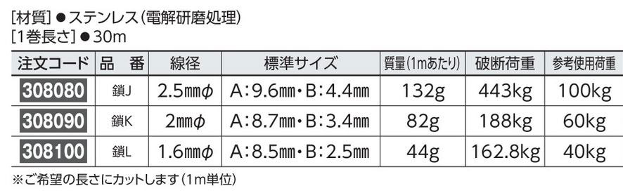 メーカー:日本緑十字社 線径 1.6mmΦ 標準サイズ A:8.5mm・B:2.5mm 質量(1mあたり) 44g 破断荷重 162.8kg 参考使用荷重 40kg 価格(1mあたり) 材質 ステンレス(電解研磨処理) 1巻長さ 30m ※ご希望の長さにカットします(1m単位)