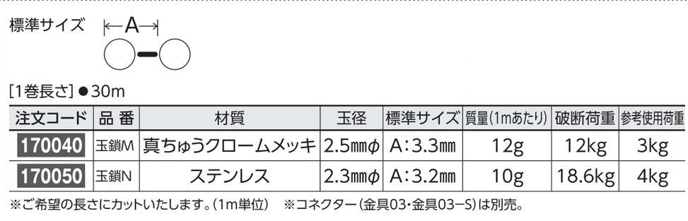 メーカー:日本緑十字社 1巻長さ 30m 材質 真ちゅうクロームメッキ 玉径 2.5mmΦ 標準サイズ A:3.3mm 質量(1mあたり) 12g 破断荷重 12kg 参考使用荷重 3kg 価格(1mあたり) ※ご希望の長さにカットいたします。(1m単位) ※コネクター(金具03・金具03-S)は別売り