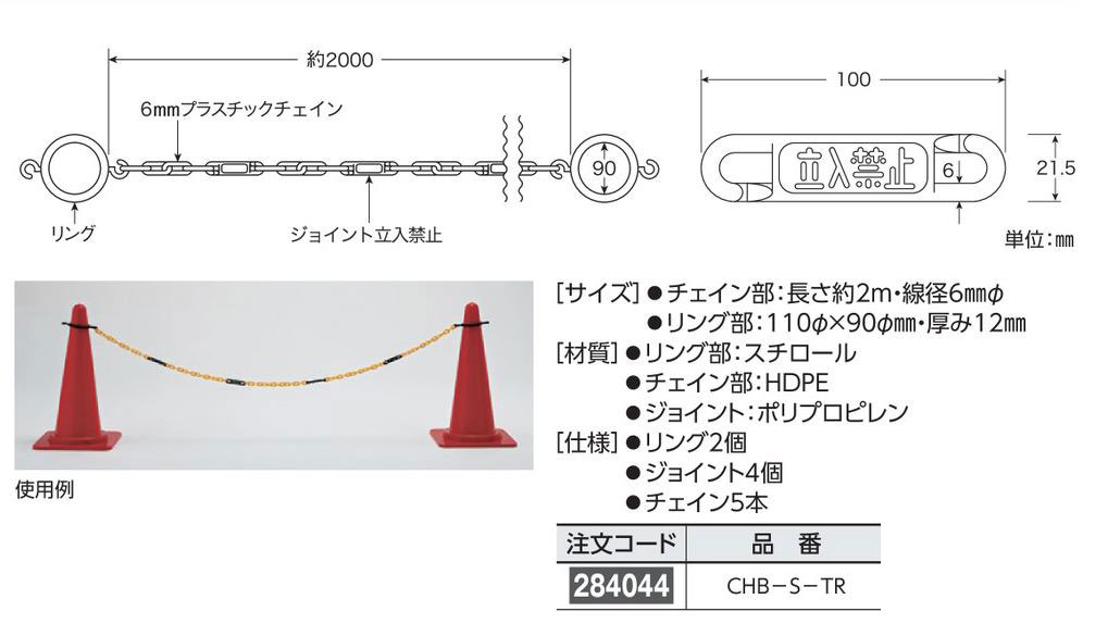 メーカー:日本緑十字社 サイズ チェイン部:長さ約2m・線径6mmΦ リング部:110Φ×90Φmm・厚み12mm 材質 リング部:スチロール チェイン部:HDPE ジョイント:ポリプロピレン 仕様 リング2個 ショイント4個 チェイン5本