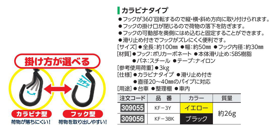 カラー イエロー 質量 26g サイズ 全長:約100mm 幅:約50mm フック内径:約30mm 材質 フック:ポリカーボネート 本体滑り止め:SBS樹脂 バネ:スチール テープ:ナイロン 参考使用荷重 3㎏ 仕様 カラビナタイプ 滑り止め付き 直径20~40mmのパイプに対応 用途 台車 整理棚 車内