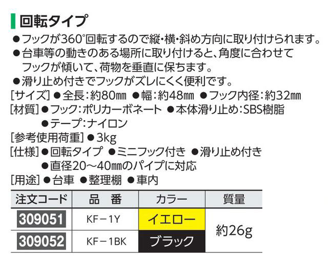 カラー ブラック 質量 26g サイズ 全長:約80mm 幅:約48mm フック内径:約32mm 材質 フック:ポリカーボネート 本体滑り止め:SBS樹脂 テープ:ナイロン 参考使用荷重 3㎏ 仕様 回転タイプ ミニフック付き 滑り止め付き 直径20~40mmのパイプに対応 用途 台車 整理棚 車内