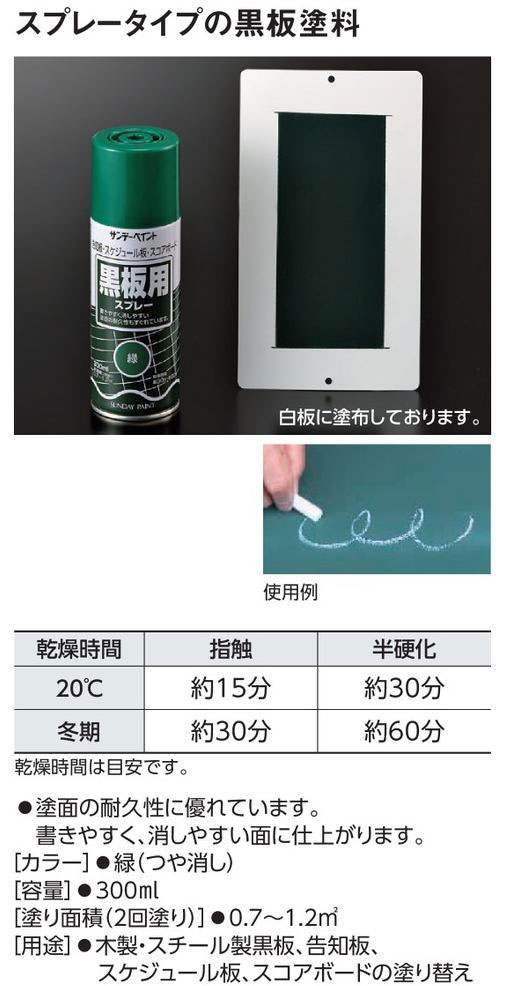 メーカー:日本緑十字社 カラー 緑(つや消し) 容量 300ml 塗り面積(2回塗り) 0.7~1.2㎡ 用途 木製・スチール製黒板、告知板、スケジュール板、スコアボードの塗り替え ※うすめ液は不要です。