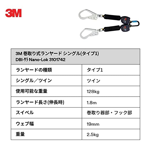 3M DBI -サラNano-Lok巻取り式ランヤード タイプ1 ツイン