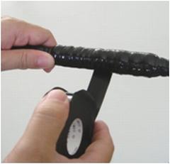 ●テープにしわがよらず、対象物に密着する程度(テープ幅が1~2mm狭くなる程度)に軽く引っ張りながら接着面を内側にして1/2の重なりで巻きつけます。引っ張り過ぎるとずれが大きくなる可能性がありますので注意してください。