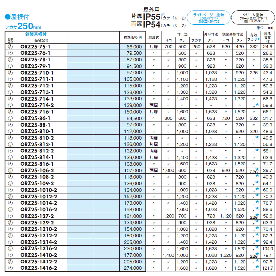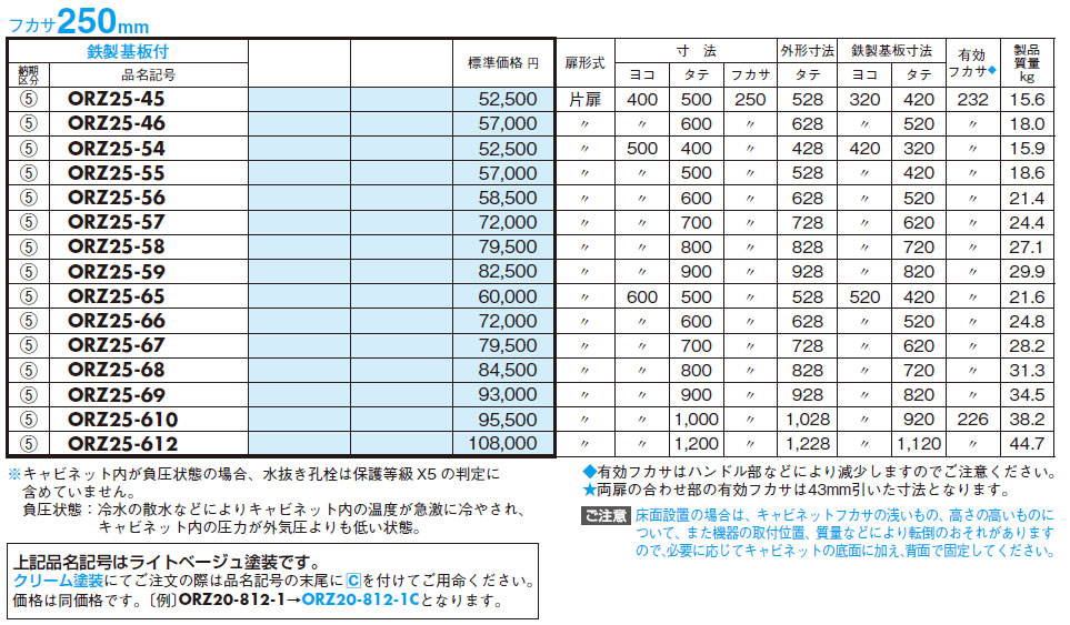 ORZ25-45 ORZ形屋外用キャビネット(水切構造、防塵・防水パッキン付)鉄製基板付