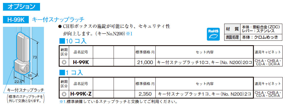 H-99K-Z CH形ボックス・オプション キー付スナップラッチ 1コ入