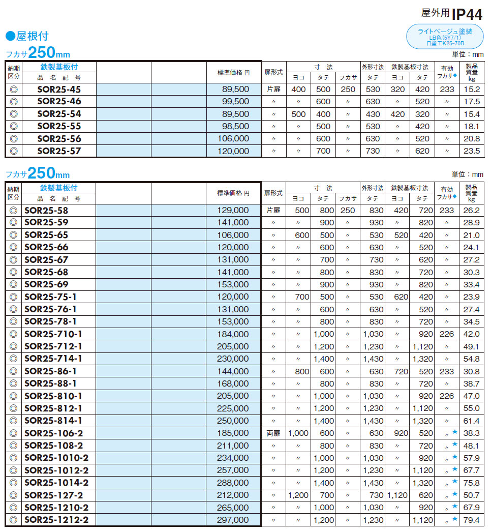 SOR25-55 ステンレス屋外用制御盤キャビネット(水切、防塵・防水パッキン付) 鉄製基板