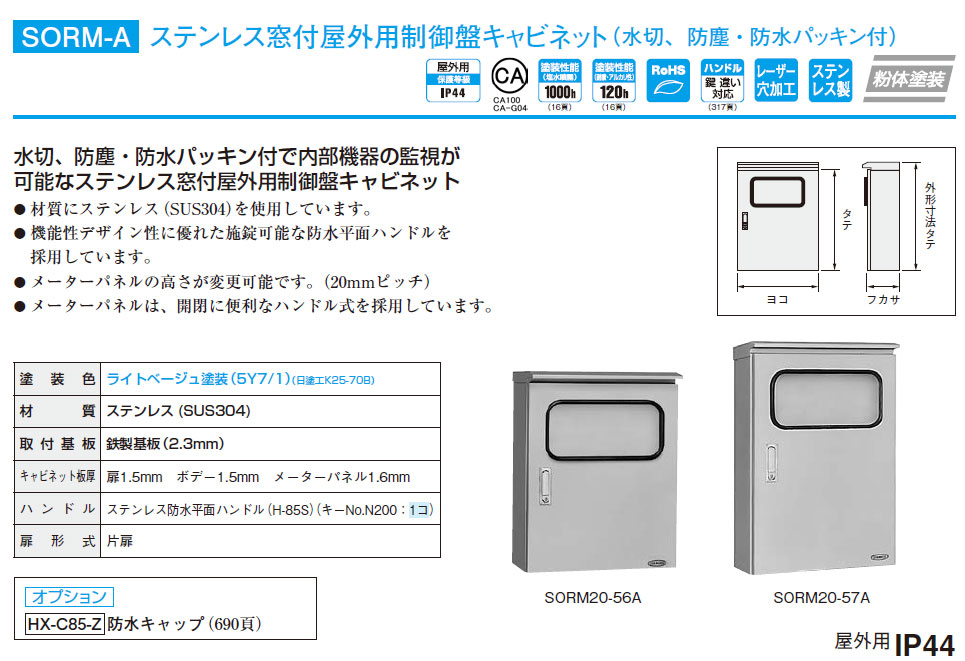 SORM20-55A ステンレス窓付屋外用制御盤キャビネット(水切、防塵・防水パッキン付) 鉄製基板