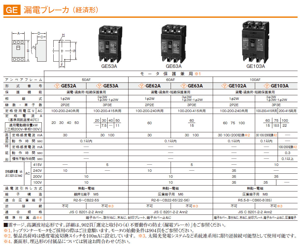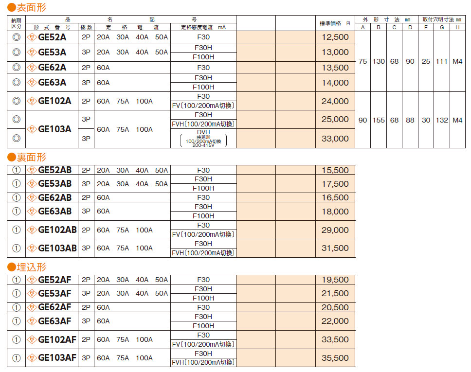 GE52A 2P 20A F30 漏電ブレーカ(経済形) 表面形