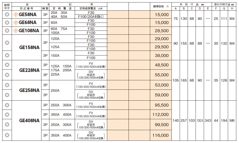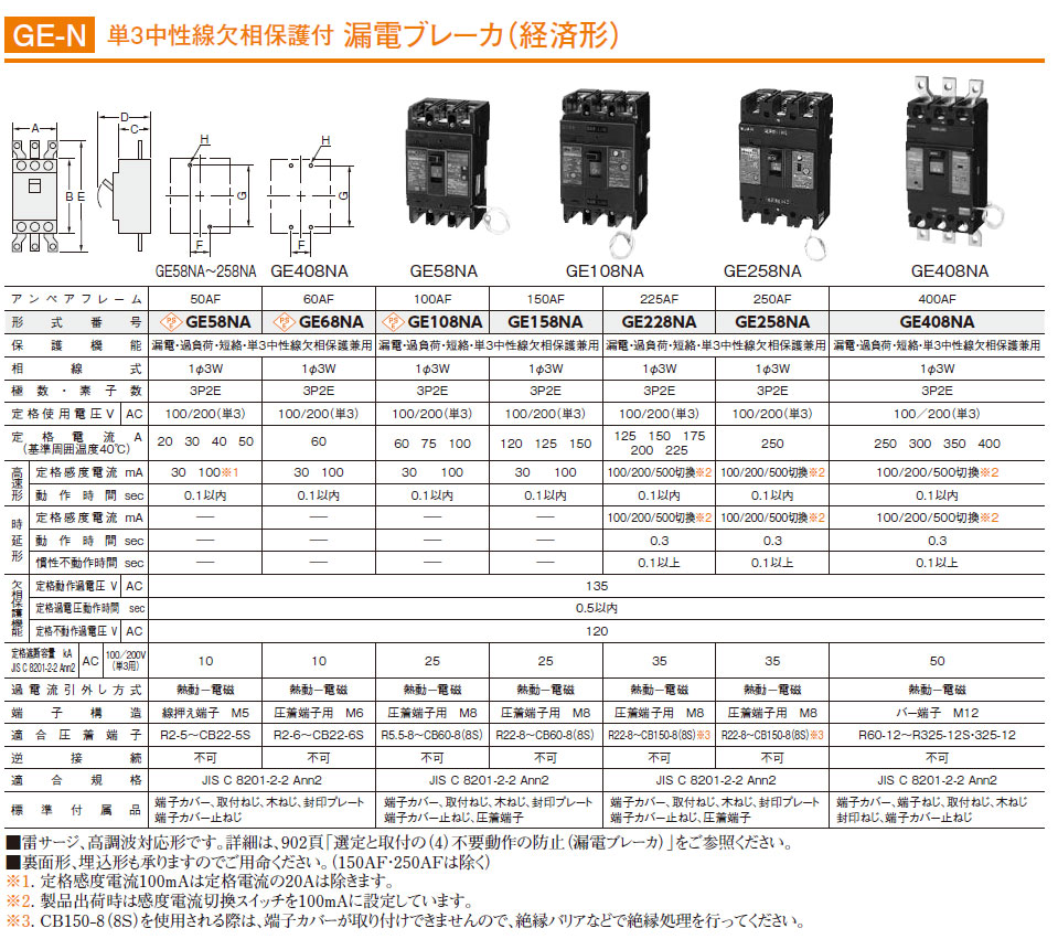 GE108NA 3P 75A F100 単3中性線欠相保護付 漏電ブレーカ(経済形)