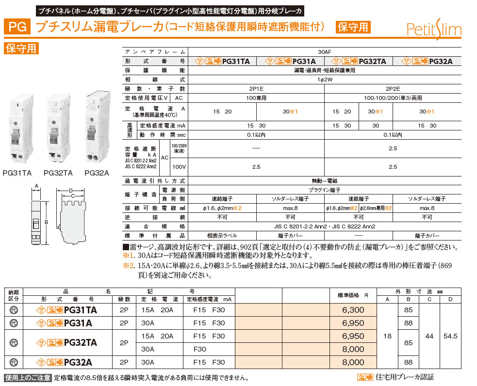 PG32TA 2P 15A F30 プチスリム漏電ブレーカ 保守用