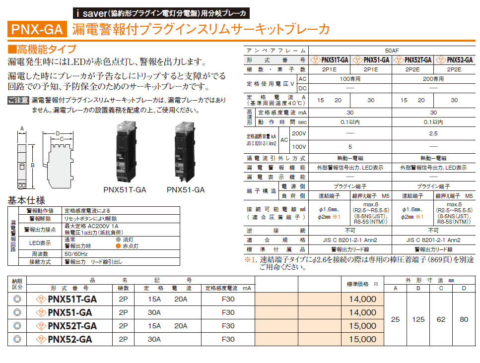 PNX52TA-GA 2P 20A F30 漏電警報付プラグインスリムサーキットブレーカ