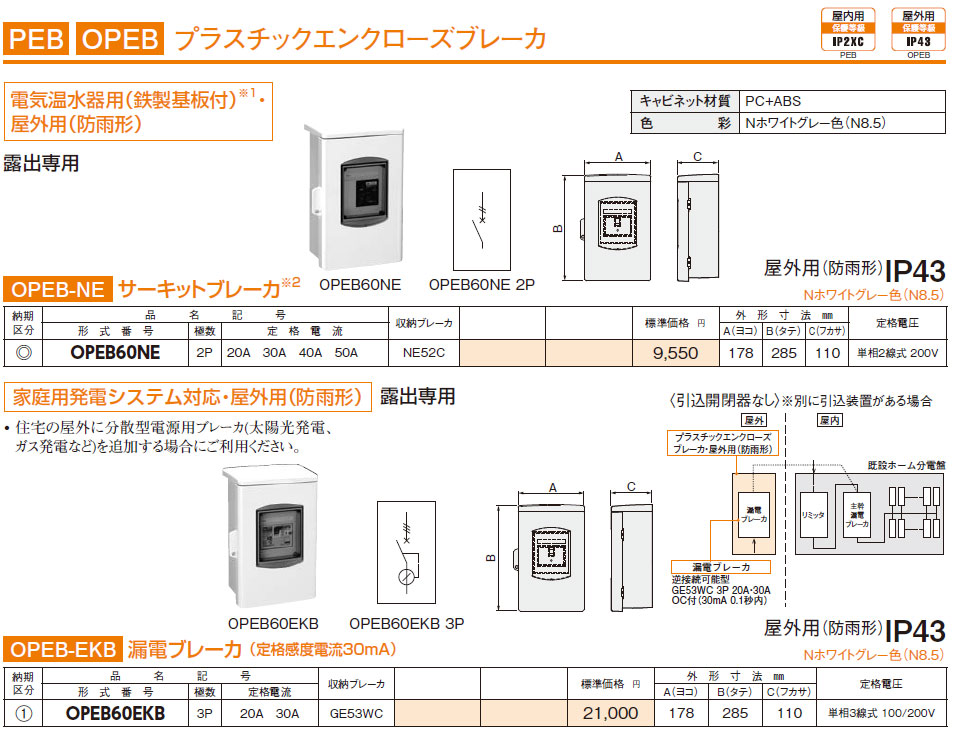 OPEB60NE 2P 30A プラスチックエンクローズブレーカ 電気温水器用(鉄製基板付)・屋外用 サーキットブレーカ