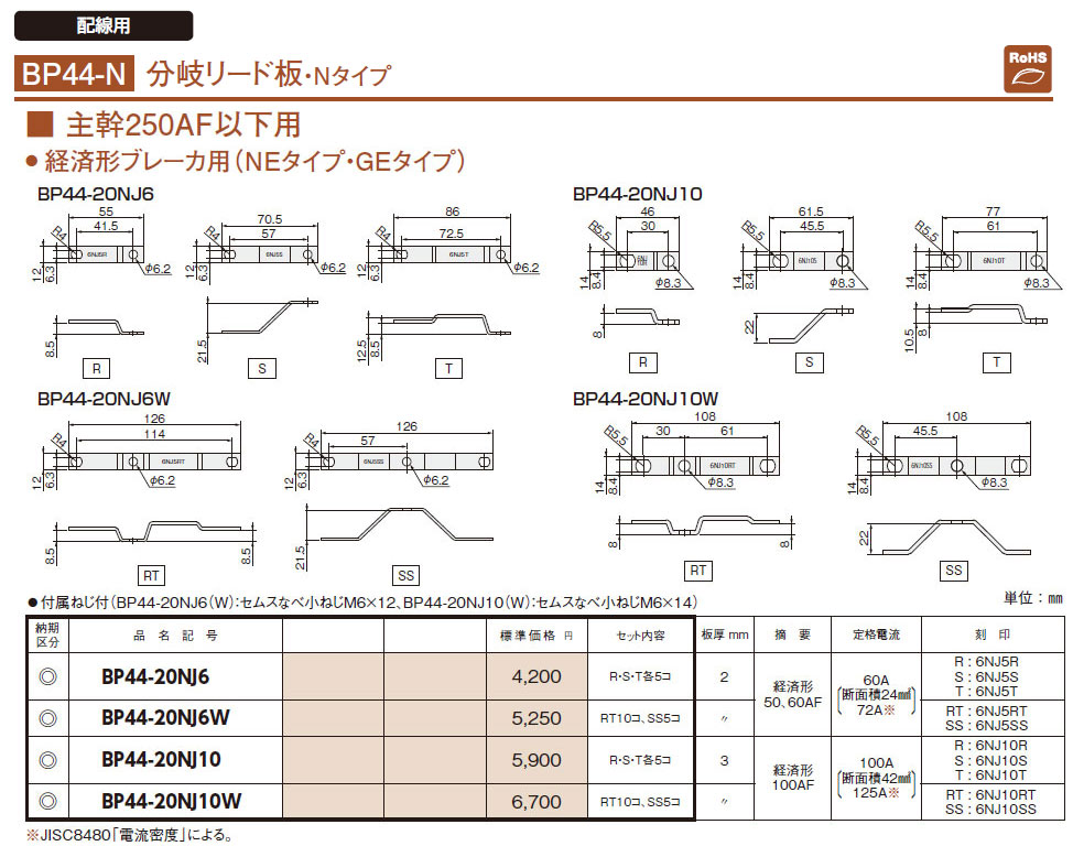 BP44-20NJ6W 分岐リード板 主幹250AF以下用 経済形ブレーカ用