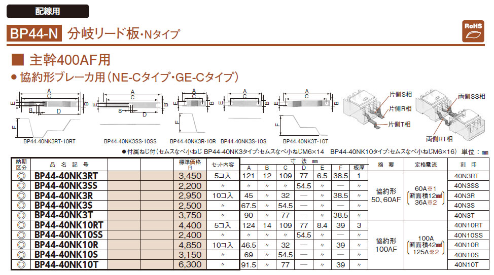 BP44-40NK10SS 分岐リード板 主幹400AF用 協約形ブレーカ用