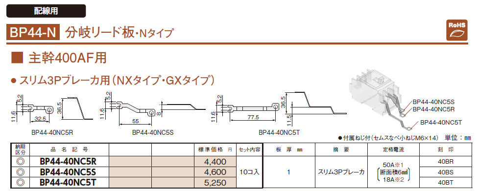 BP44-40NC5R 分岐リード板 主幹400AF用 スリム3Pブレーカ用