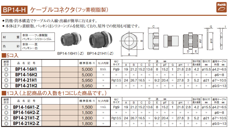 BP14-21H2 ケーブルコネクタ(フッ素樹脂製) 5コ入
