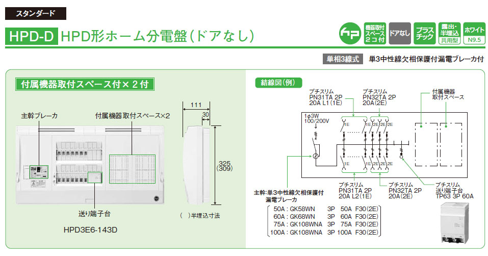 メーカー:日東工業 HPD形ホーム分電盤(ドアなし)付属機器取付スペースx2付 10+3 60A 単相3線式 単3中性線欠相保護付漏電ブレーカ付