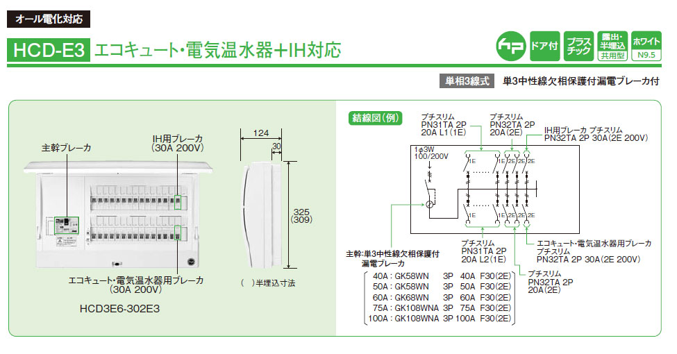 メーカー:日東工業 HCD-E3 ホーム分電盤 オール電化対応 エコキュート・電気温水器+IH対応 6+6 40A 単相3線式 単3中性線欠相保護付漏電ブレーカ付