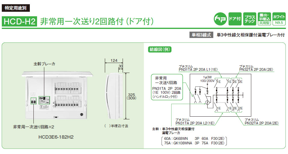 メーカー:日東工業 HCD-H2 ホーム分電盤 非常用一次送り2回路付(ドア付) 10+2 60A 単相3線式 単3中性線欠相保護付漏電ブレーカ付