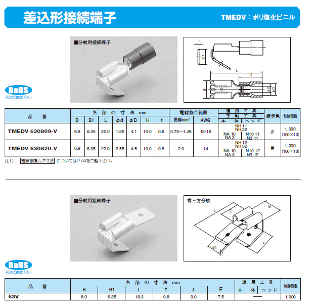 差込形接続端子 100個入 TMEDV 630809-V 赤色,630820-V 青色,63V  1000個入