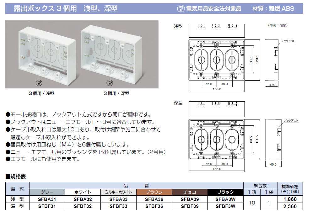 SFBA31 ニューエフモール 露出ボックス3個用浅型 1袋(1個入)
