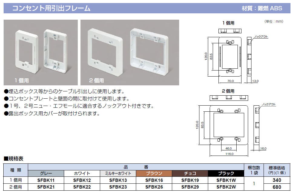 SFBK11 ニューエフモール コンセント用引出フレーム1個用 1袋(1個入)