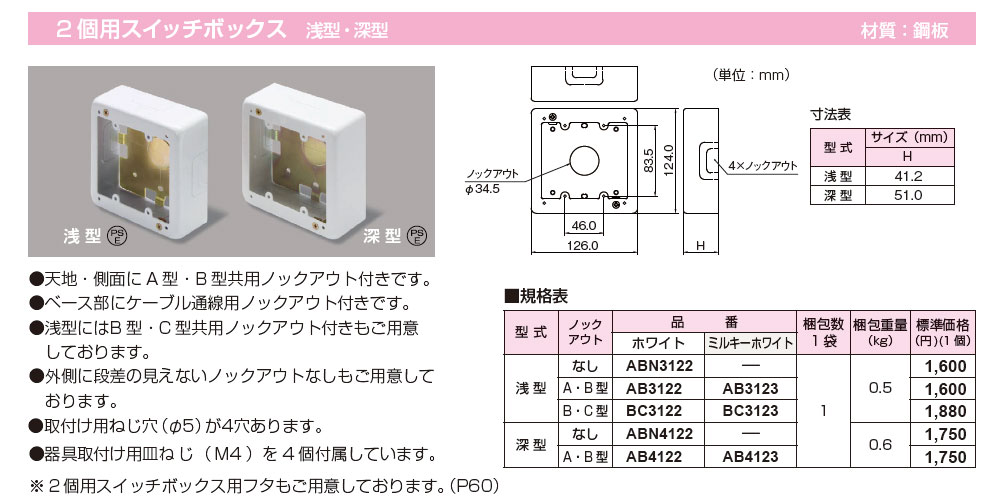 BC3122 メタルエフモール 2個用スイッチボックス浅型 1袋(1個入)