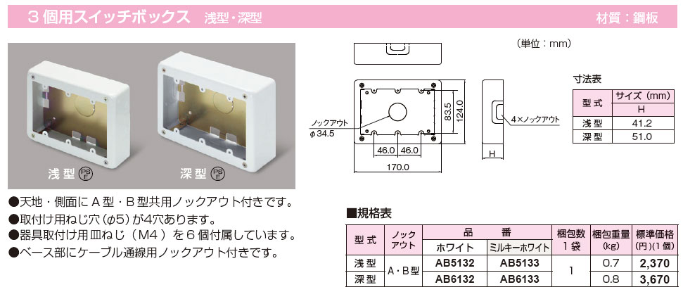 AB6132 メタルモール 3個用スイッチボックス深型 1袋(1個入)