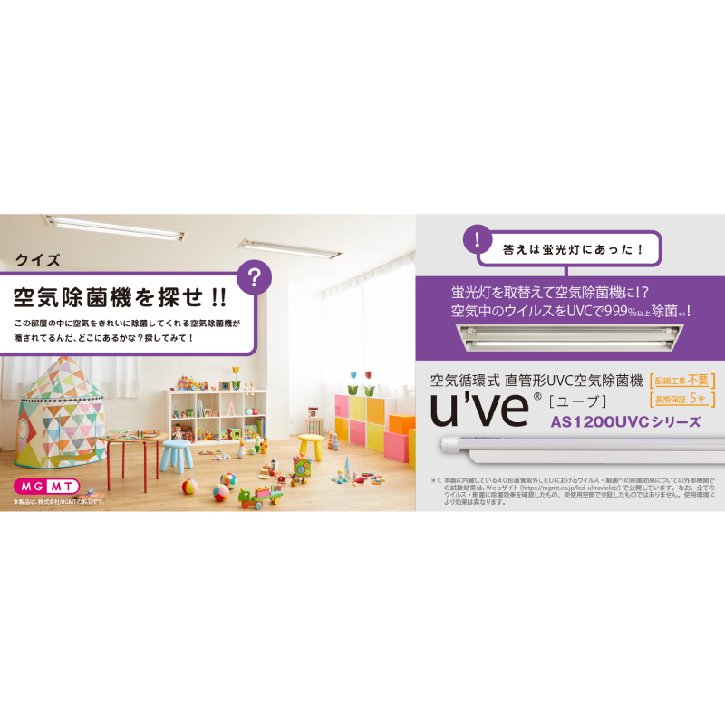 40形直管LEDを活用した空気循環式UVC除菌機。既存の蛍光灯器具に工事不要で取付けでき、室内空間のウイルス・細菌対策に適した紫外線(UVC)方式の除菌装置です。