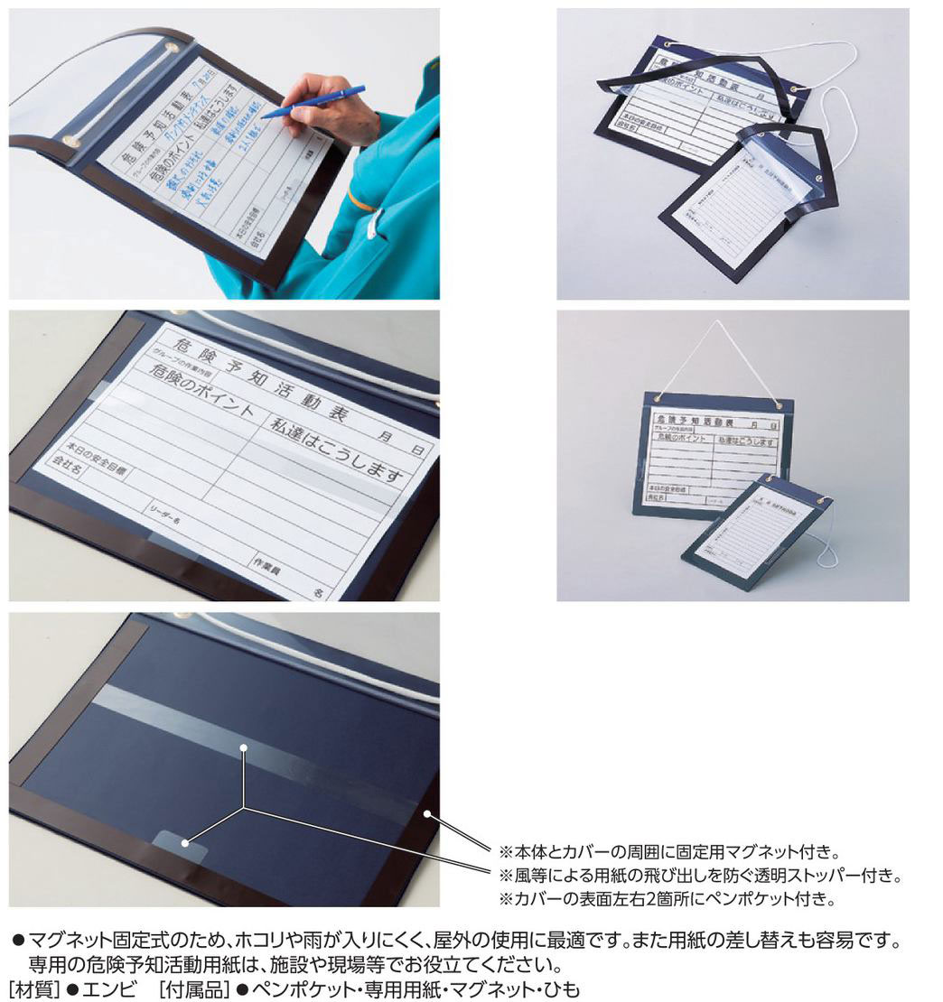 屋外でも安心の用紙挟み込みボード。サイズ 375×475㎜ 材質 エンビ 仕様 A3ヨコタイプ 付属品 ペンポケット・専用用紙・マグネット・ひも 用紙表示内容 危険予知活動表