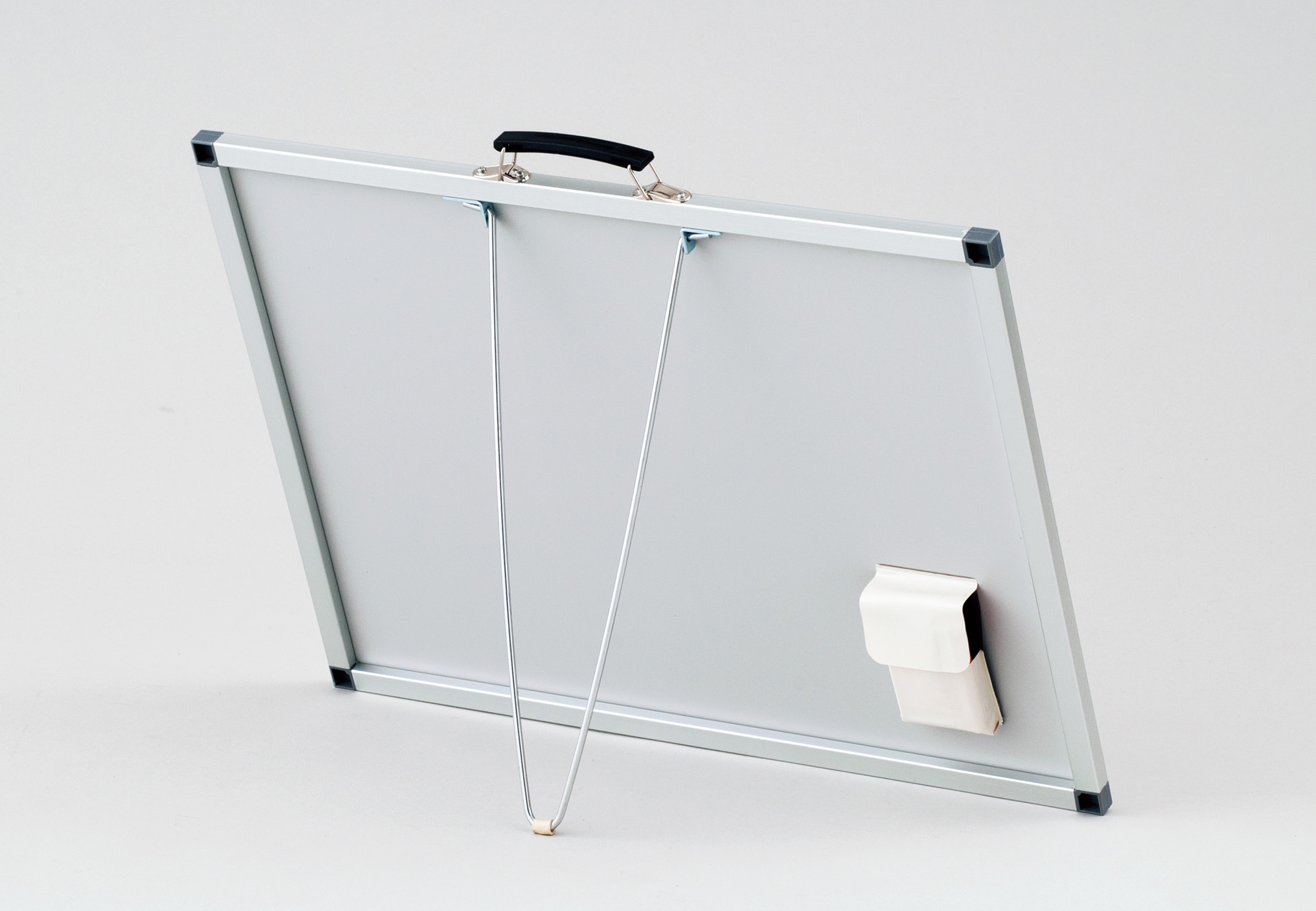 サイズ 445×595×15㎜ 質量 2kg 材質 枠:アルミ 板面:スチール(ホワイトボード) 付属品 マーカーペン(赤・黒)・ラーフル・立掛け金具