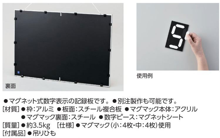 サイズ 615×915×25㎜ 材質 枠:アルミ 板面:スチール複合板 マグマック本体:アクリル マグマック裏面:スチール 数字ピース:マグネットシート 質量 約3.5kg 仕様 マグマック(小:4枚・中:4枚)使用 付属品 吊りひも