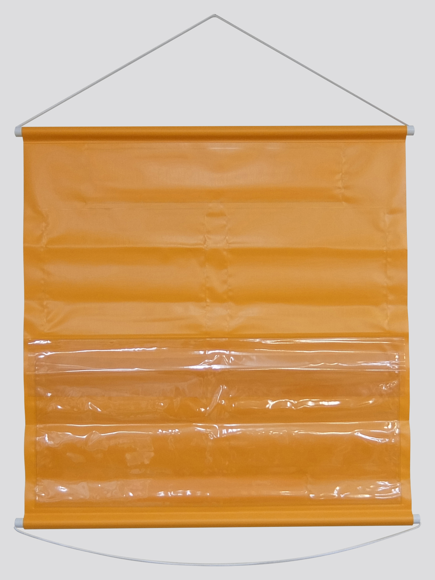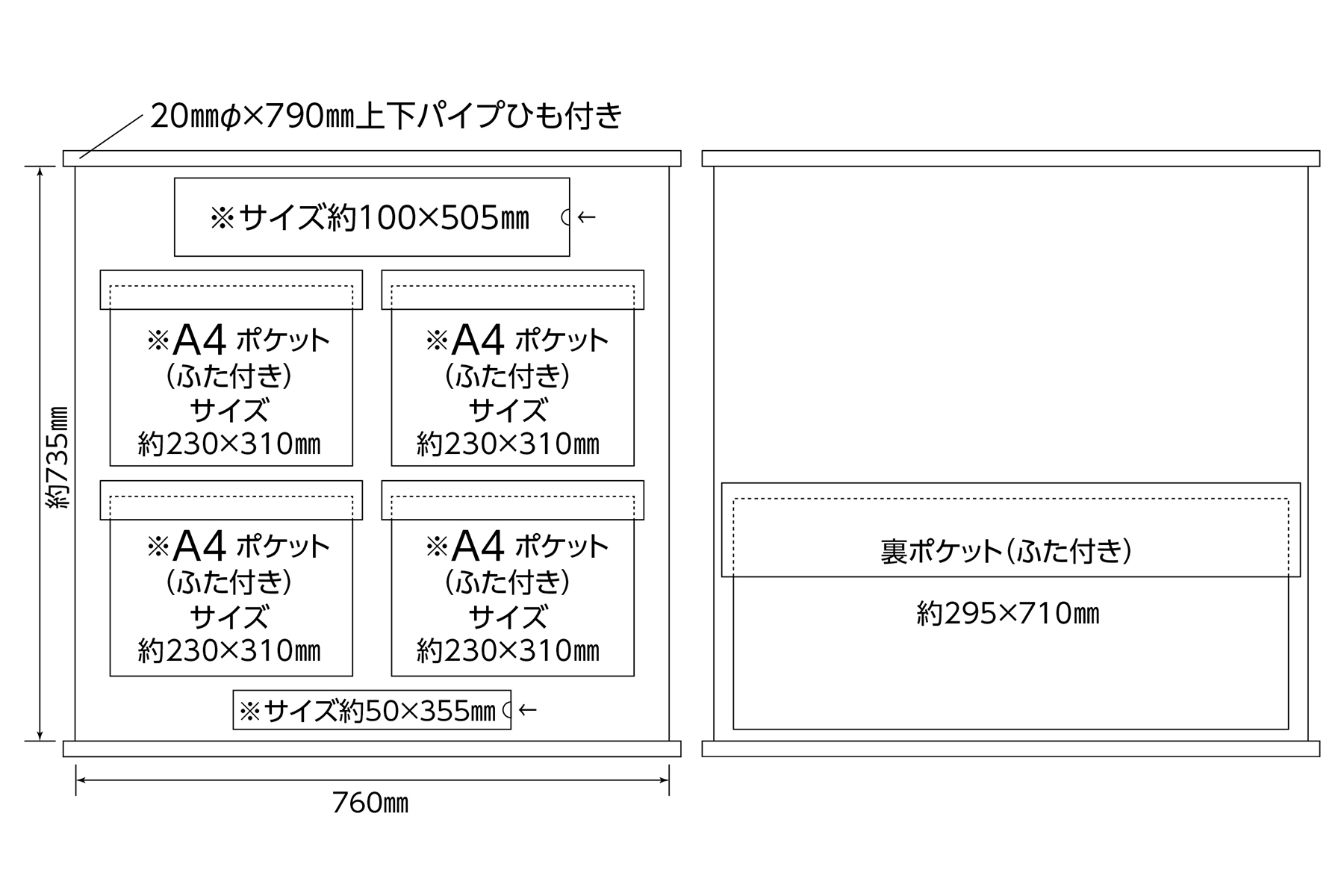 簡単に掲示板が完成!サイズ 約810×760㎜ 材質 本体:ターポリン ポケット:PVC 仕様 表面:A4横サイズポケット×4 裏面:ポケット×1 付属品 タイトル表示板(表示内容:安全掲示板)×1枚 社名用厚紙×1枚 上下パイプ ひも カラー オレンジ