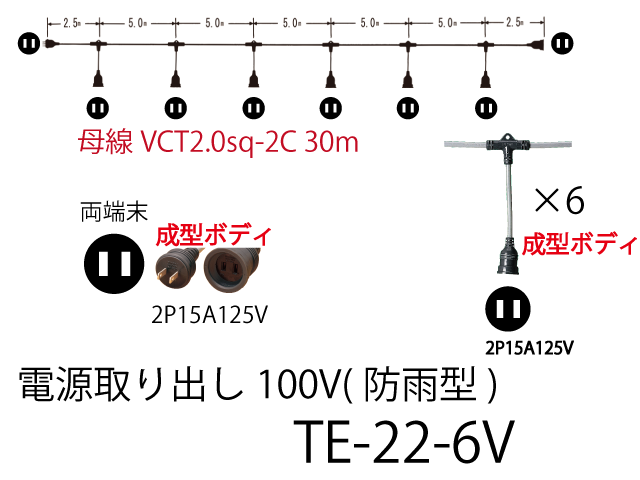 | TE-22-6V | 30 | 2.0sq-2C | 0.25 | 1.25sq-2C | 6 | 0 | 成型防水2P15A | |