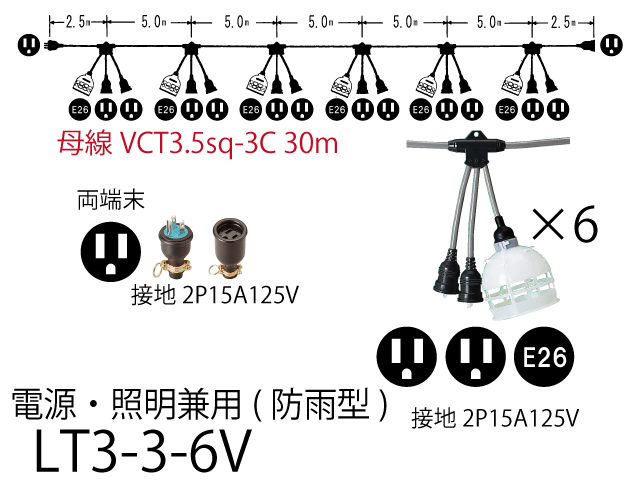 | LT3-3-6V | 30 | 3.5sq-3C | 0.25 | 0.2 | 電源 VCT2.0sq-3C 照明 VCT1.25sq-2C |