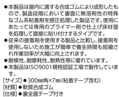 メーカー:日本緑十字社 サイズ 300mm角×7mm(粘着テープ含む) 材質 軟質合成ゴム 仕様 裏全面テープ付き (注意喚起用) ※専用プライマー1kg缶(300mm角約30枚分)別売り。(専用プライマーに関してはお問い合わせください)