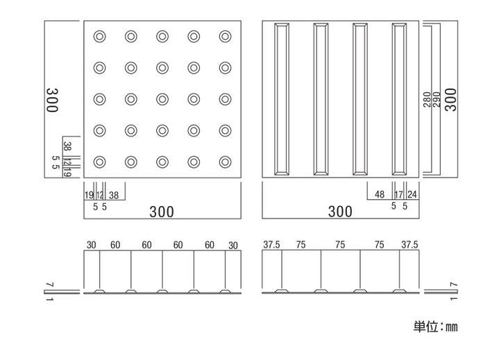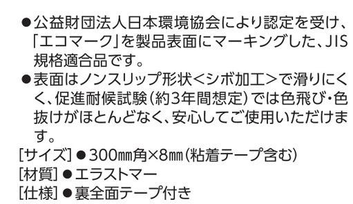 メーカー:日本緑十字社 サイズ 300mm角×8mm(粘着テープ含む) 材質 エラストマー 仕様 裏全面テープ付き (歩行方向指示用) ※専用プライマー1kg缶(300mm角約30枚分)別売り。(専用プライマーに関してはお問い合わせください)
