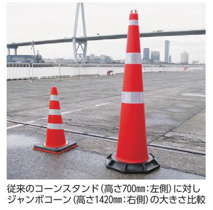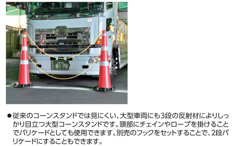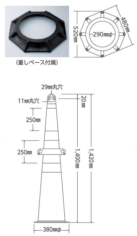 サイズ 高さ:1420mm ベース径:380mm 重しベース径:520mmφ(8角形) 材質 本体:高密度ポリエチレン 重しベース:再生ゴム 質量 本体:2.3kg 重しベース:5kg 仕様 反射シート3段付き 付属品 重しベース