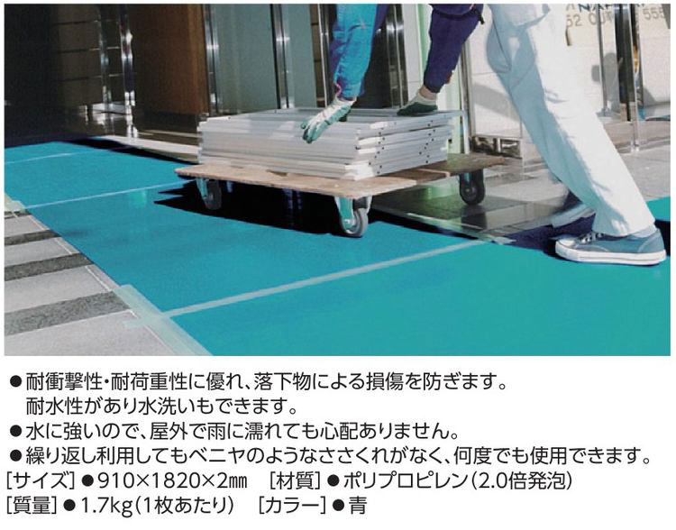 サイズ 910×1820×2mm 材質 ポリプロピレン(2.0倍発泡) 質量 1.7kg(1枚あたり) カラー 青 10枚1組
