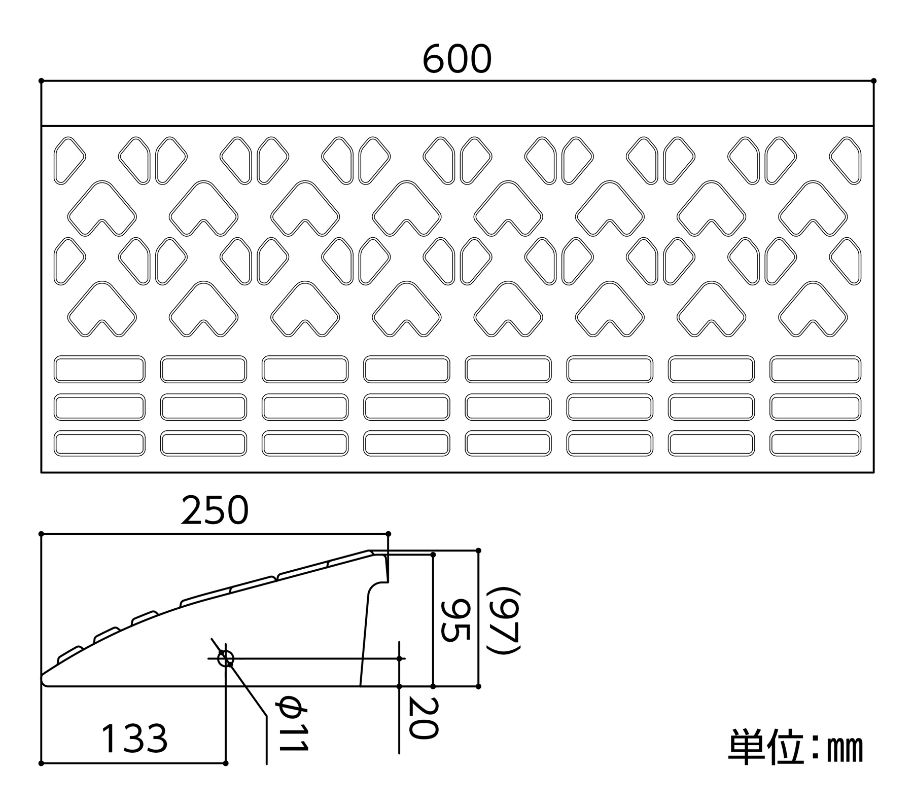 サイズ H95×W600×D250mm 質量 7.5kg 材質 再生ゴム カラー ブラック 仕様 連結チプ 付属品 ボルト・ナット×各1個、ワッシャー×2個