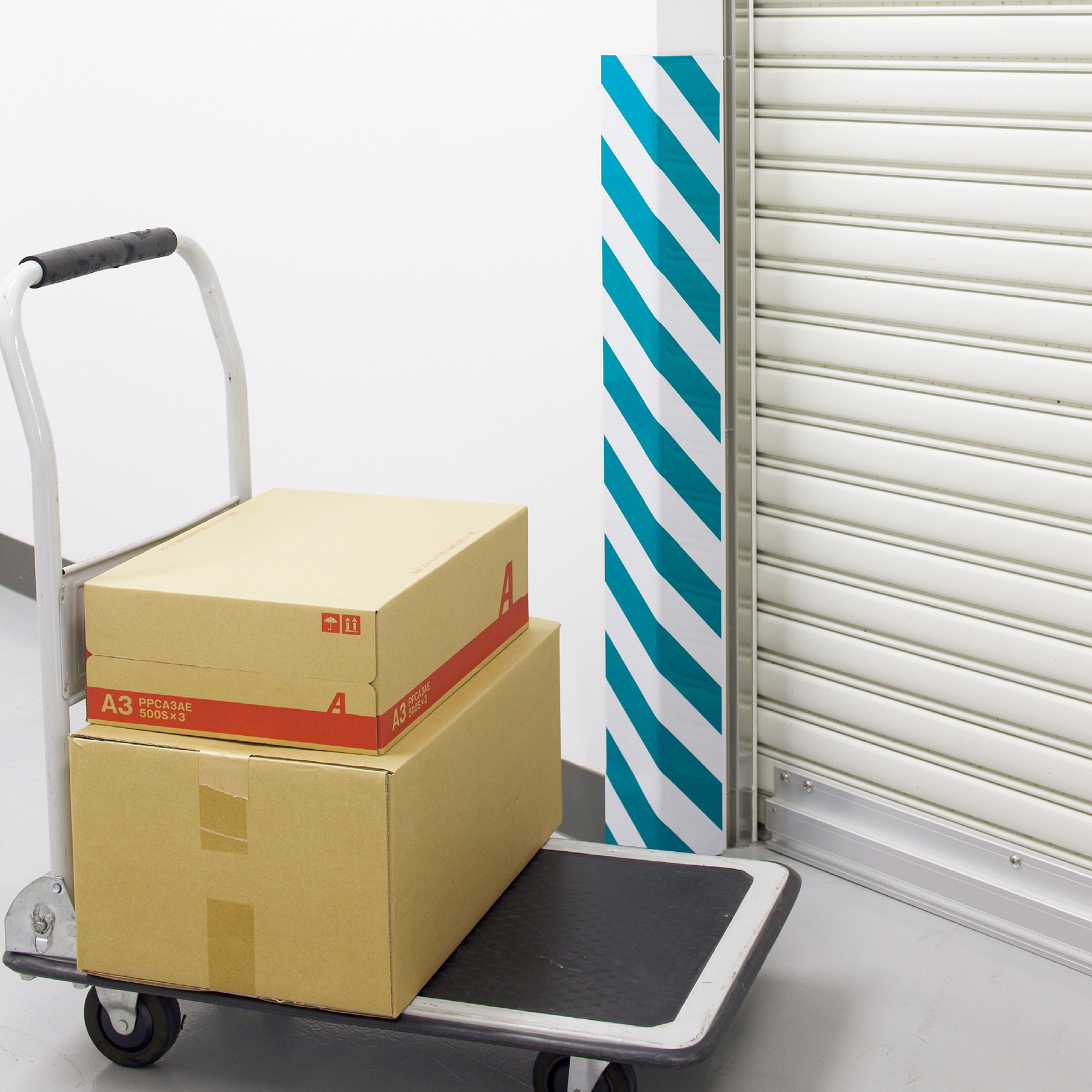 建物の凹凸部分に手軽に貼れ、危険標示とクッション機能で人や建物を保護します。駐車場や工事現場等の危険防止に。